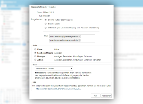 An interne Nutzer (lesen und/oder schreiben) und per Link an externe Nutzer (nur Lesen).